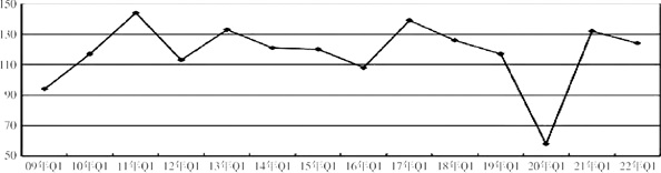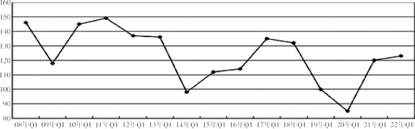 2022年一季度,外贸出口景气指数为100,比上季度下降了3个百分点,与去年同期持平,位于"微景气区间"(见图7)。其中,有27%的调查企业国外订单有了新的增长,比上季度下降了2个百分点;有46%的企业反映销售"持平",比上季度上升了1个百分点;有27%的企业反映"下降",比上季度上升了1个百分点。